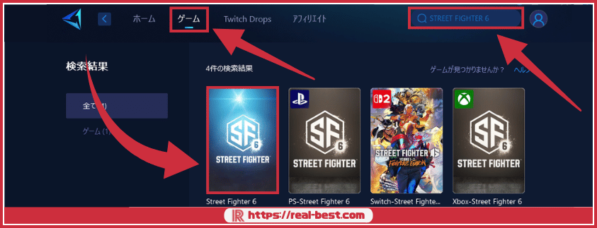 - アプリのゲームライブラリから「Street Fighter 6」を検索して選択します。SF6のアイコンが表示されるので、クリックして対象ゲームとして設定します。