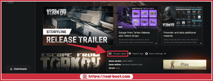 - ランチャー下部、大きな「Play」ボタンのすぐ上にある「Change region」(または現在のサーバー名が表示されている部分)をクリックします。